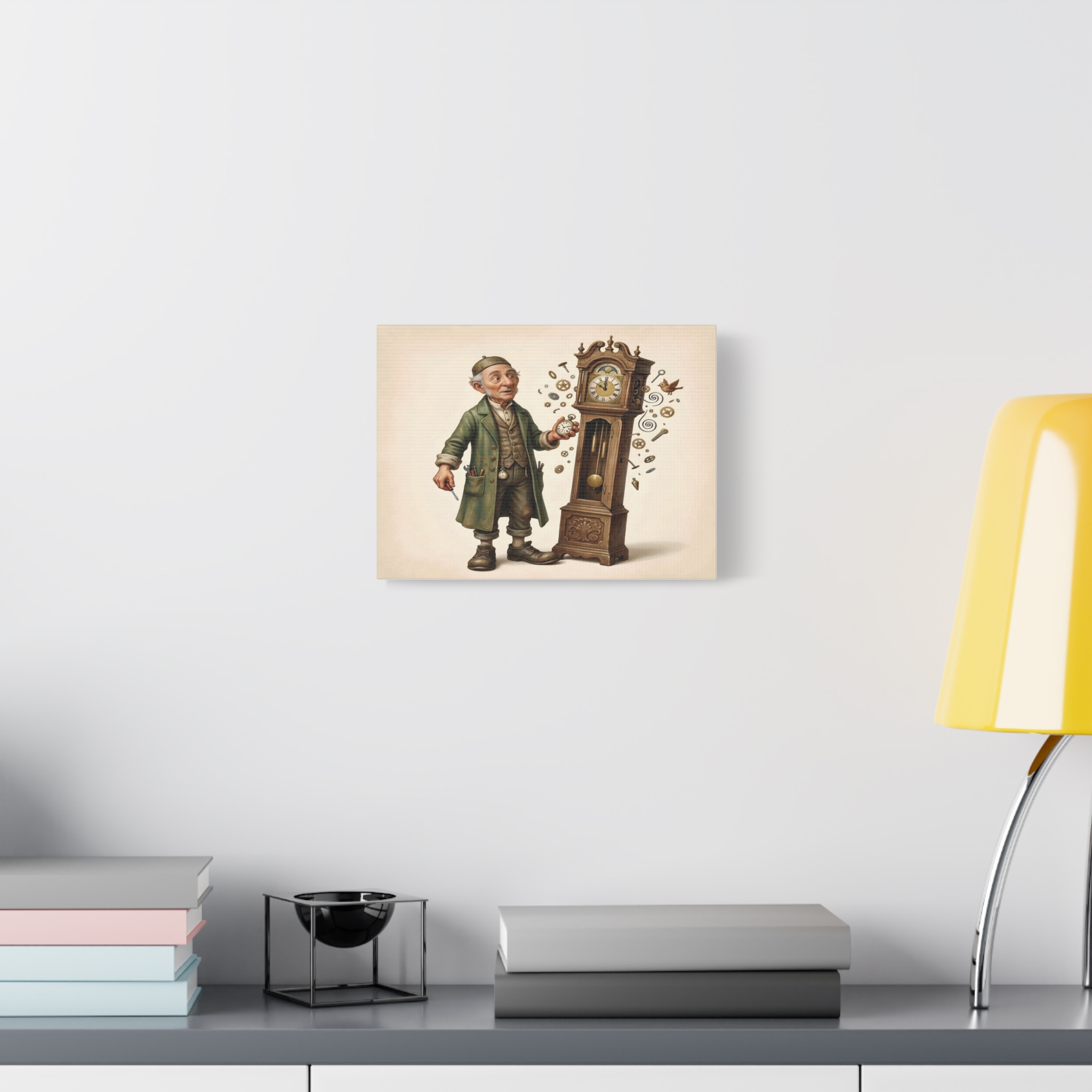 Full of character, warmth, and storytelling charm, this artwork celebrates the art of horology and the timeless fascination with mechanical clocks. The detailed grandfather clock, the expressive clockmaker, and the playful movement of floating gears make this piece both nostalgic and imaginative.