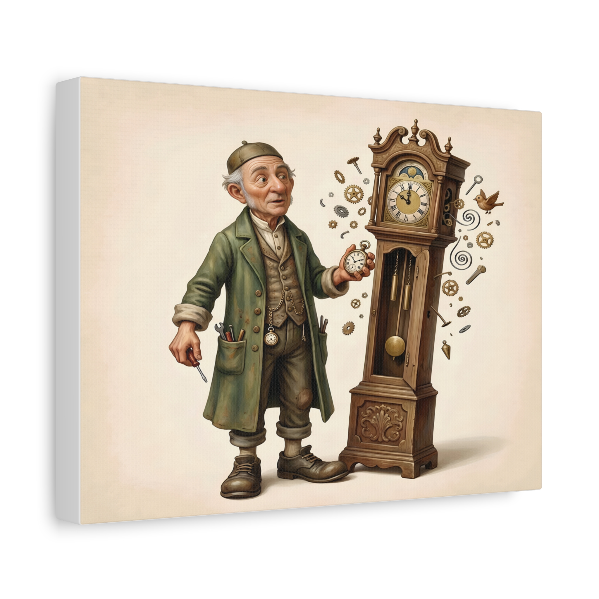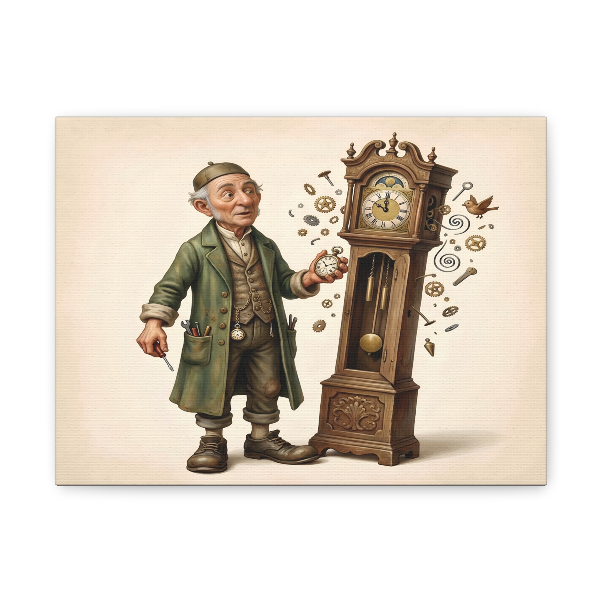 This whimsical illustration captures that magical moment. Standing beside his grandfather clock, the old clockmaker watches in surprise as tiny brass gears, springs, and clock parts drift into the air around him. It is as if time has slipped free from its carefully crafted mechanism.